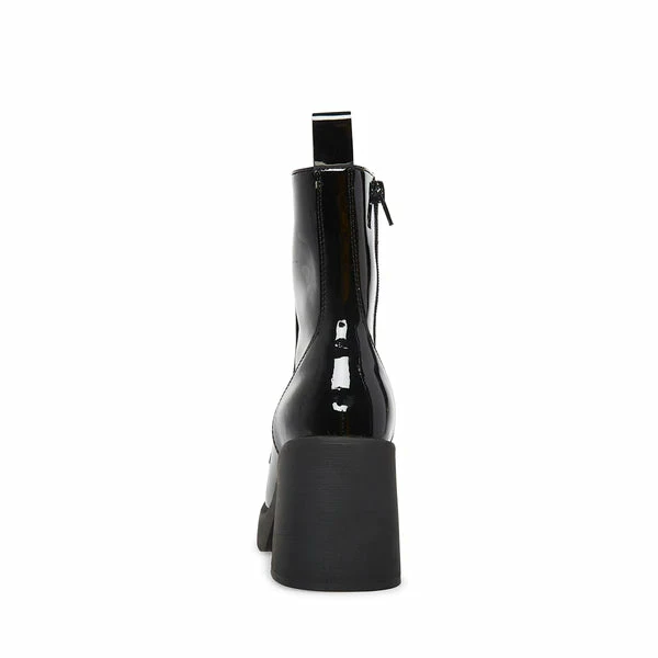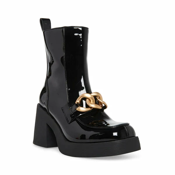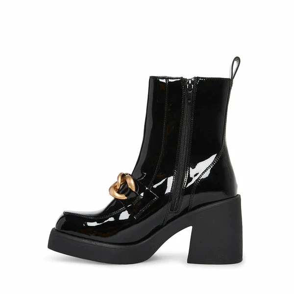 Decorated with a gold chain accent, BLOOMS’ glossy vegan upper is perched on a block heel for a bold look.Β