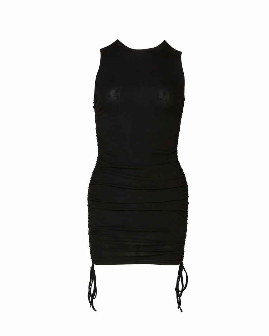 Fire emojis. This hot lil’ number is a rib knit sleeveless mini dress with a bodycon fit and sexy cinch detailing on the sides. Now complete with an opaque material, so you never have to worry about sheerness. Need.