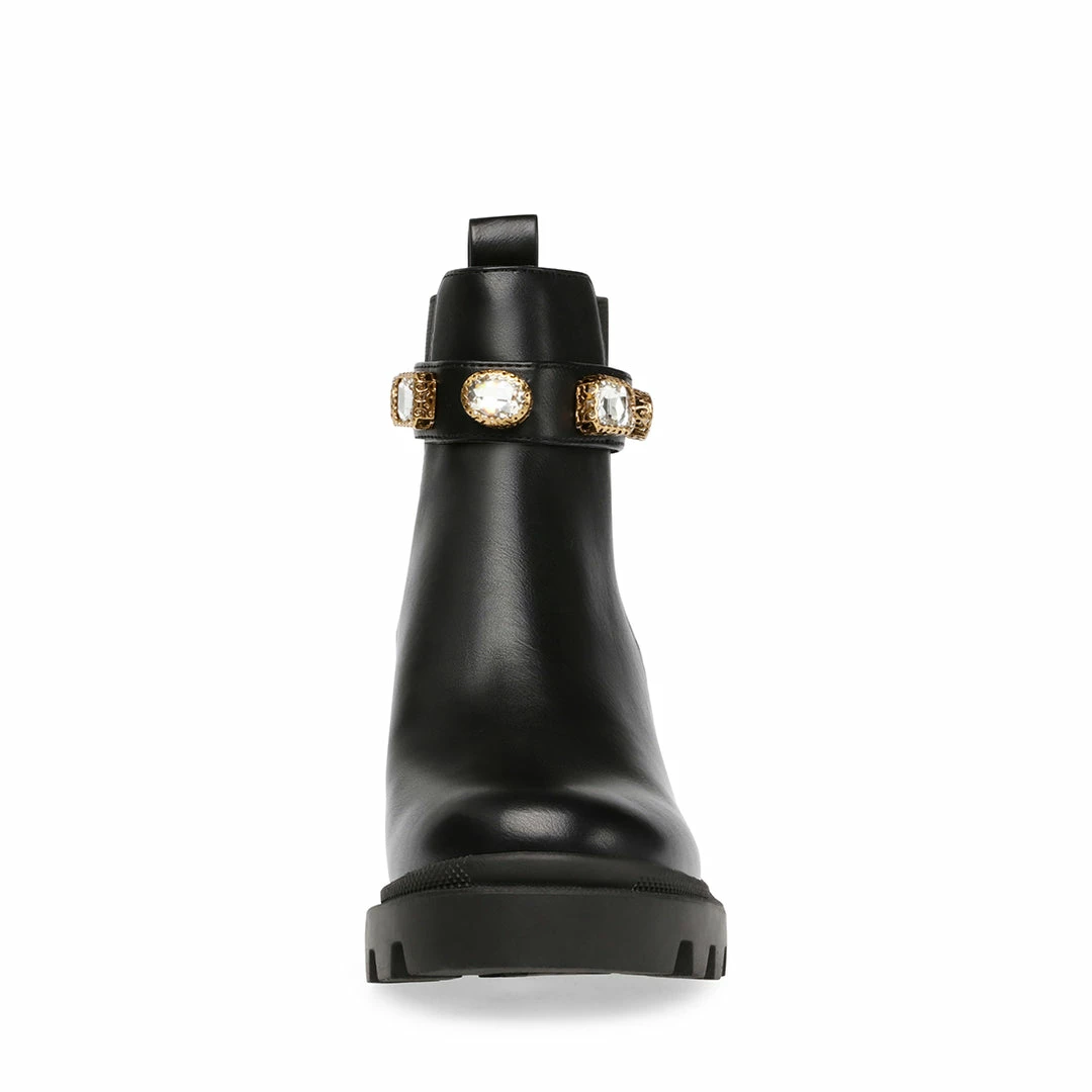 Jewellery-meets-footwear! A rhinestone-adorned strap elevates AMULET’s stretchy pull-on shaft, while a chunky heel and treaded sole provide support and stability.