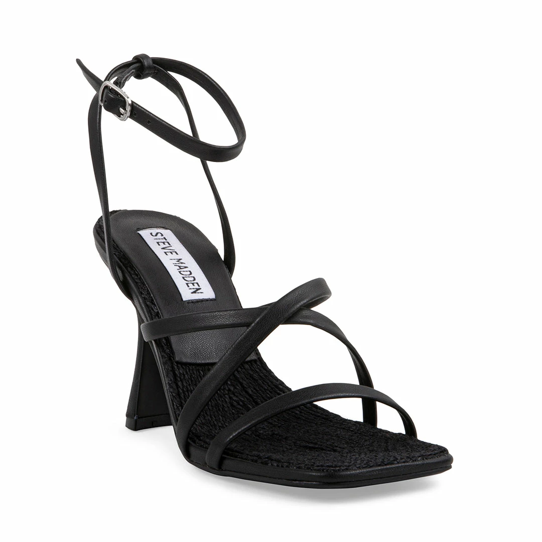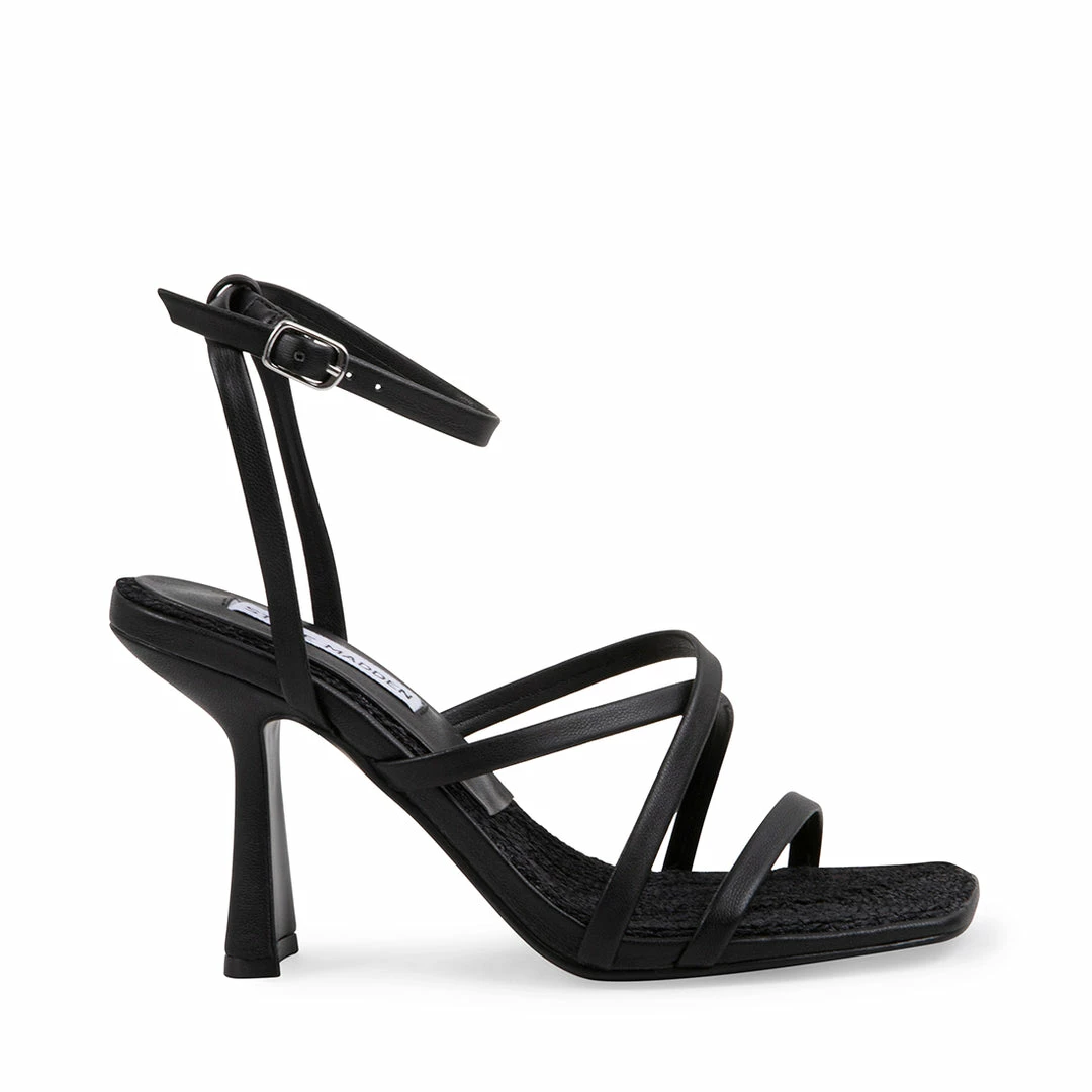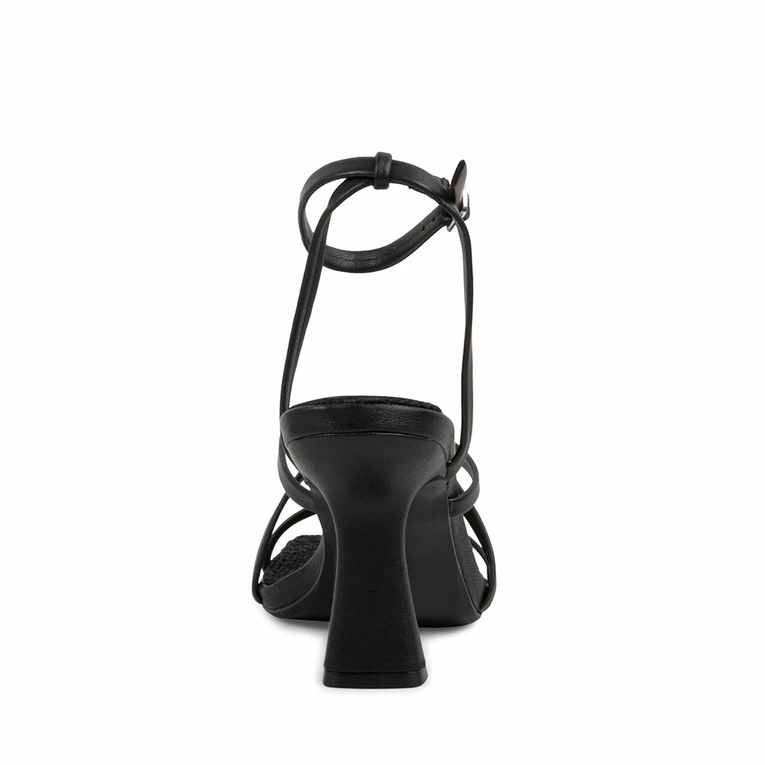 A BLESSING in the world: a minimalist sandal with slim straps framed by a sleek square toe and flared heel.Β