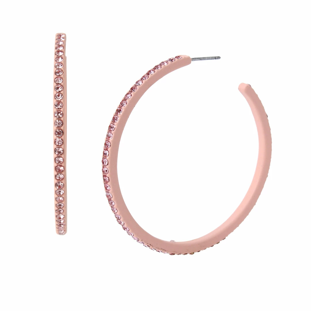 Sleek and skinny minimal open hoop earrings adorned with glistening colored pave. These sparkly earrings are set in matte plated metal and have a post back closure.