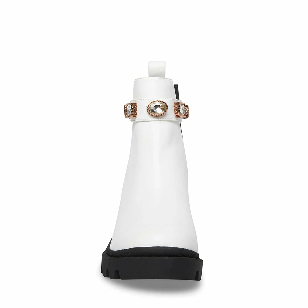 Jewellery-meets-footwear! A rhinestone-adorned strap elevates AMULET’s stretchy pull-on shaft, while a chunky heel and treaded sole provide support and stability.