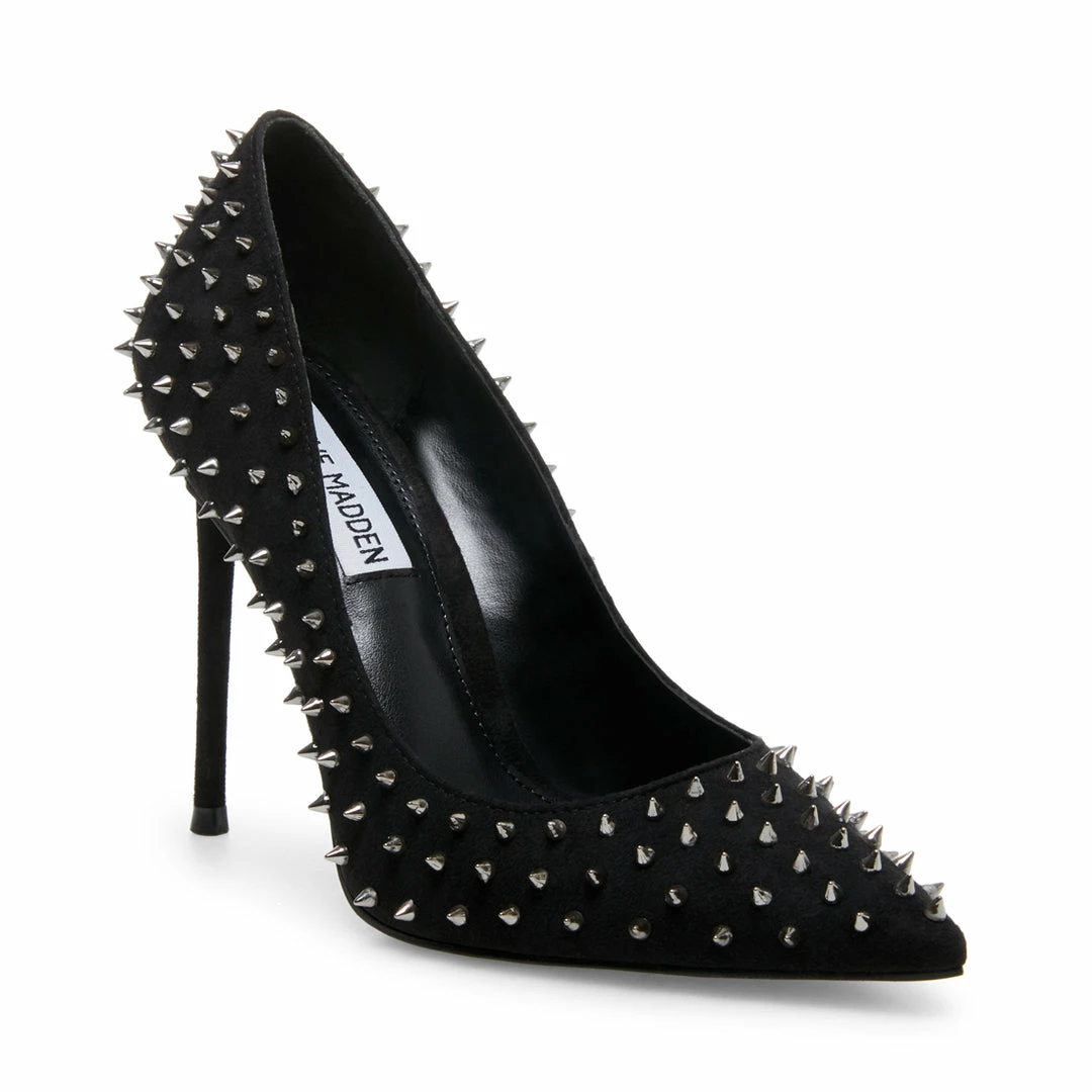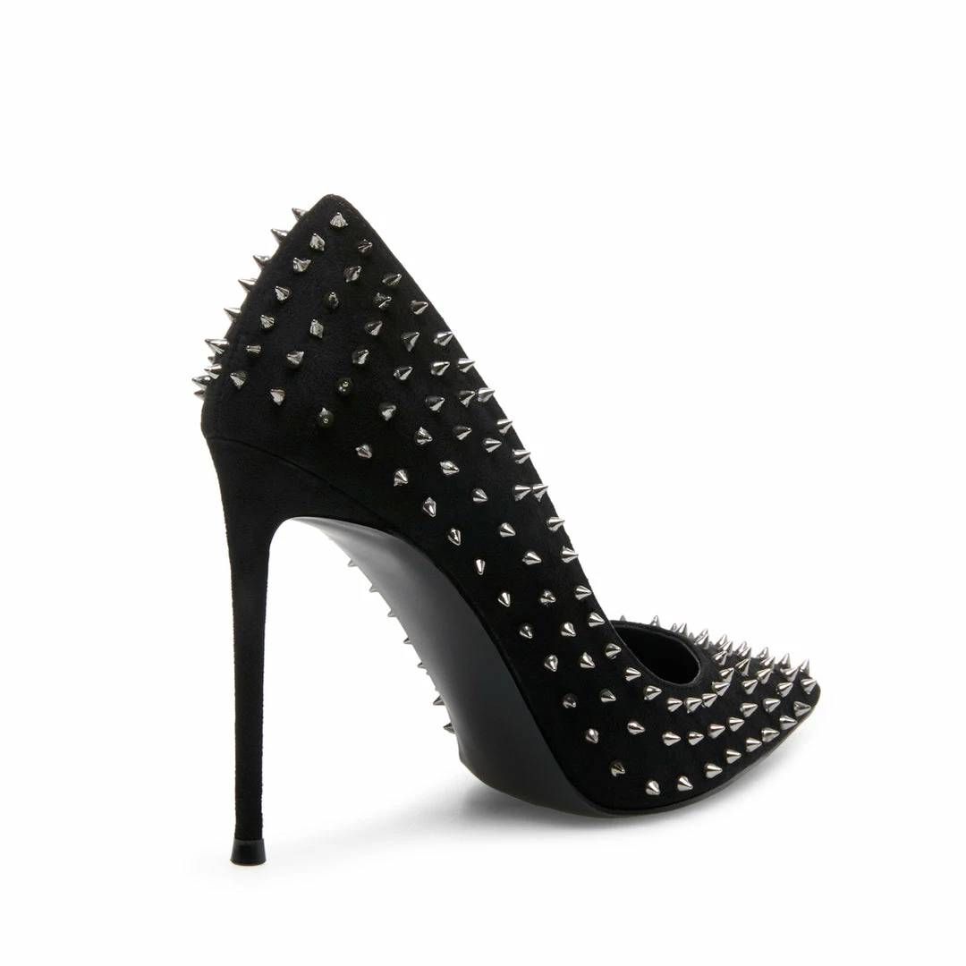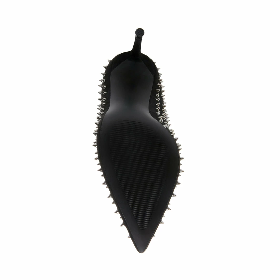 Make a fierce statement day or night donning VALA-S! This sharp pump is covered in metal spikes that accentuate its pointy toe and stiletto heel.
